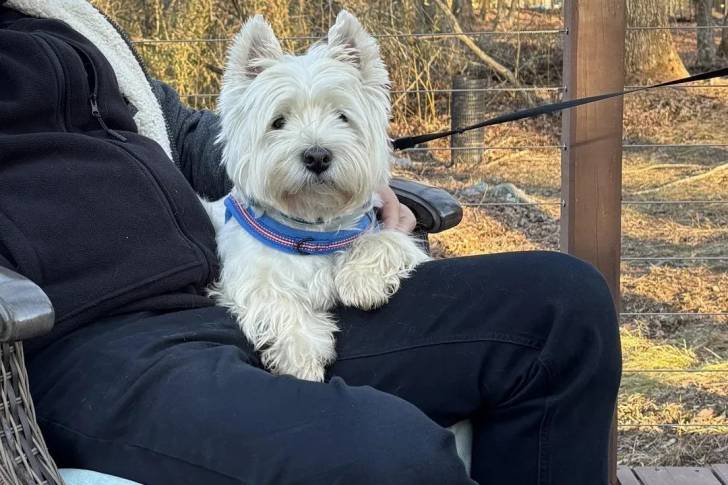 Un West Highland Doxie allongé sur les cuisses d'une personne et portant un collier au cou