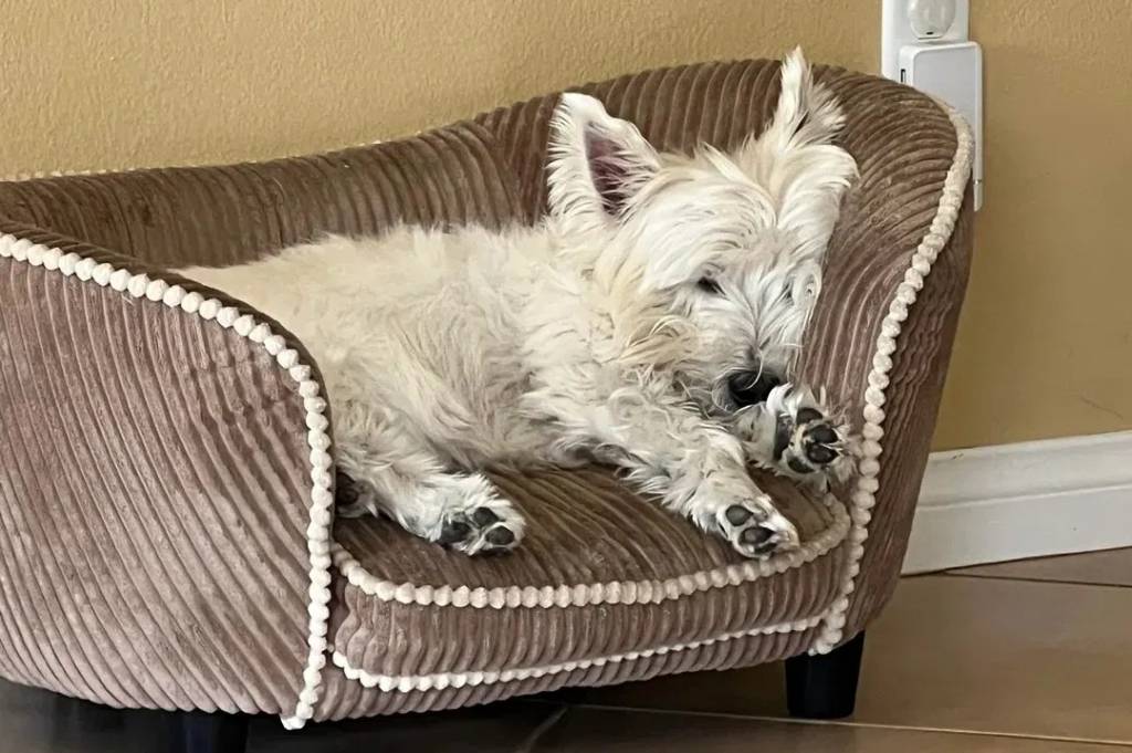Un West Highland Doxie allongé dans un petit canapé et semblant dormir