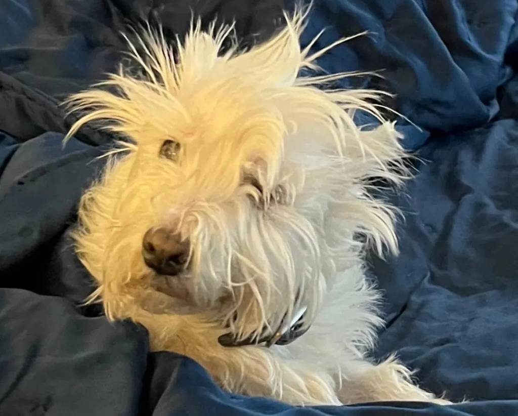 Un West Highland Doxie allongé sur un lit et portant un collier au cou