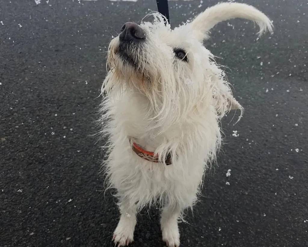 Un West Highland Doxie sur une surface bétonnée et qui est tenu en laisse