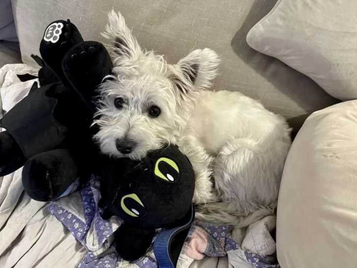 Un West Highland Doxie assis dans un canapé et ayant une peluche dans la gueule