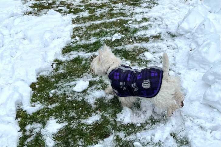 Un West Highland Doxie sur une surface enneigée et portant un harnais