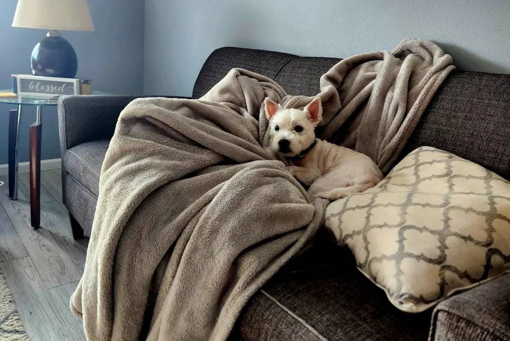 Un West Highland Doxie allongé sur un canapé et portant un collier autour du cou
