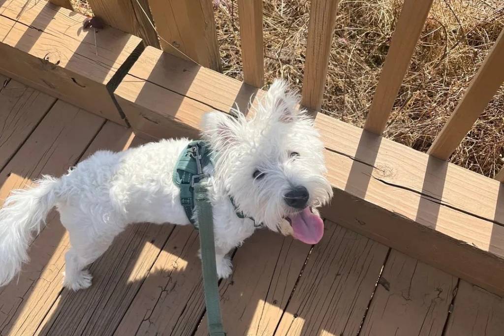 Un West Highland Doxie tirant la langue et qui est tenu en laisse