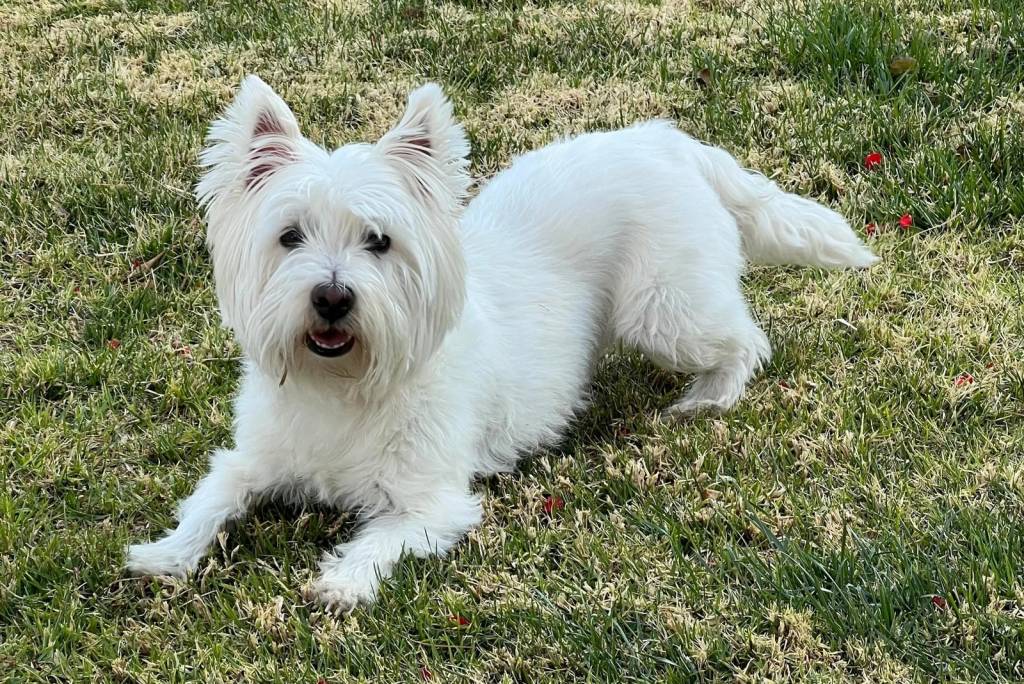 Un West Highland Doxie allongé sur un terrain herbeux et regardant vers la caméra