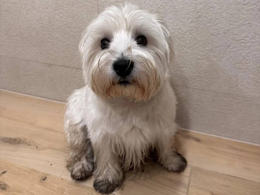 Un West Highland Doxie assis sur un plancher et regardant vers la caméra