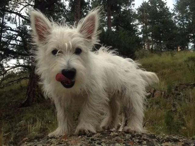 Un West Highland Doxie regardant vers la caméra et léchant son museau