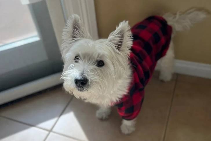 Un West Highland Doxie sur un sol carrelé et portant un habit pour chien
