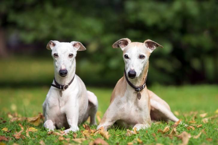 Deux Whippets allongés dans un parc