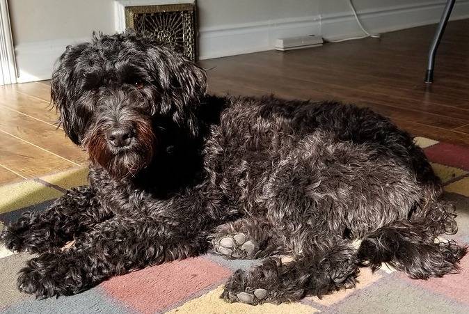 Un Woodle noir couché dans une maison sur un sofa
