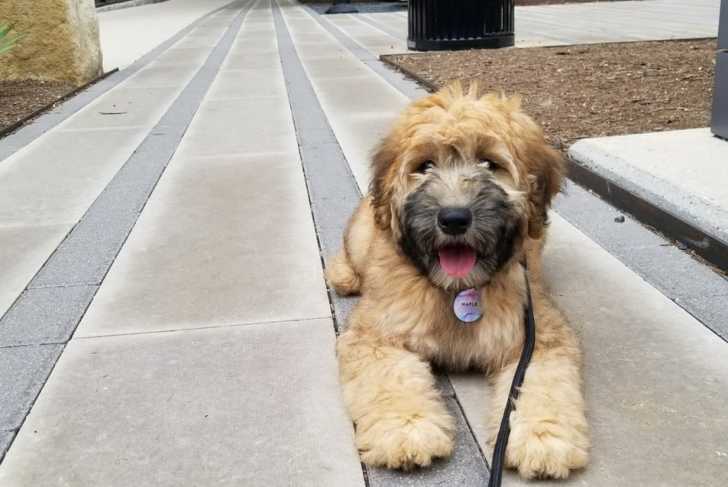 Un Woodle tenu en laisse et couché sur son ventre au sol à l'extérieur