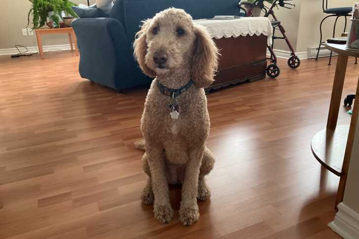 Un Woodle assis sur un plancher et portant un collier autour du cou