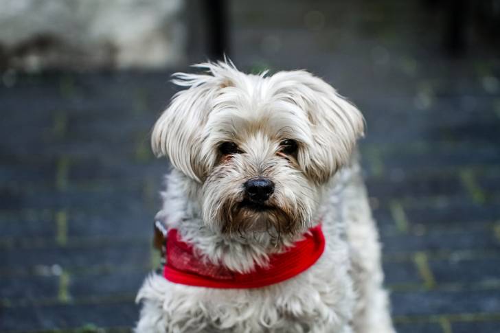 Un Yorkipoo adulte au pelage tout blanc se tient face à nous dans une rue pavée.