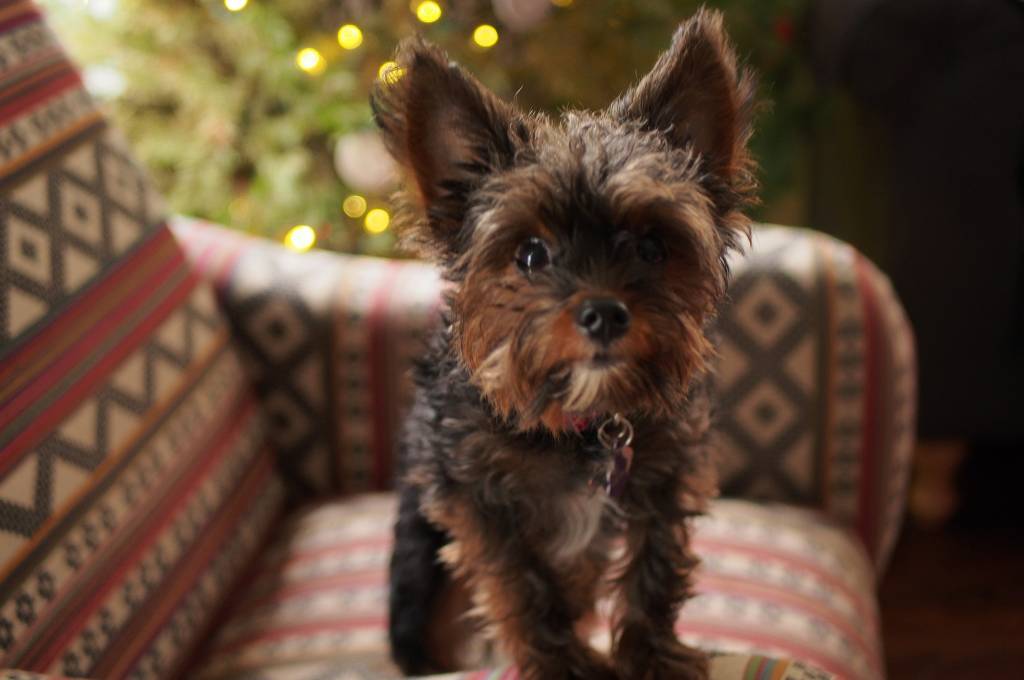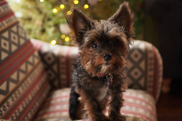 Un chiot Yorkipoo au pelage noir et marron se tient debout sur un canapé avec un sapin de Noël.