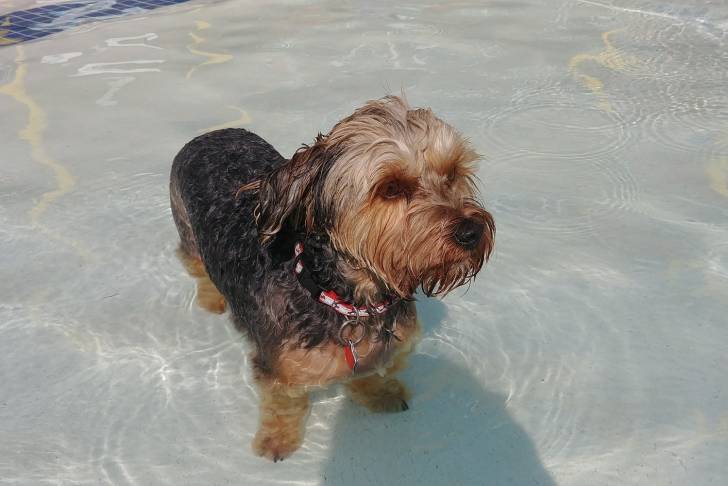 Un Yorkipoo portant un collier rouge et blanc se promène dans un bassin rempli d'eau.