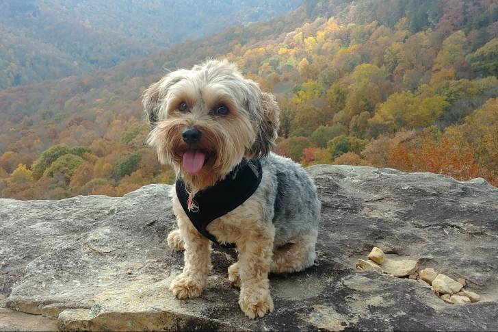 Un jeune Yorkipoo beige tire la langue et prend la pose devant de grandes étendues de forêts.