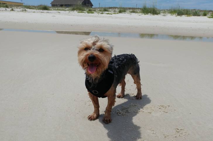 Un petit Yorkipoo portant un harnais se promène sur une plage de sable fin.