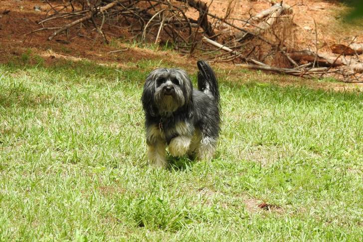 Un Yorkipoo âgé aux longs poils gris se promène seul dans l'herbe avec des branchages derrière lui.