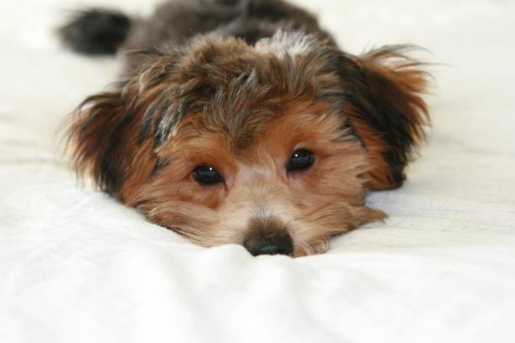 Un bébé Yorkipoo aux poils beiges et noirs, allongé sur le ventre dans des draps blancs.