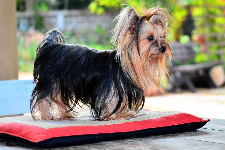 Un bébé Yorkshire s'amuse comme un fou avec une balle