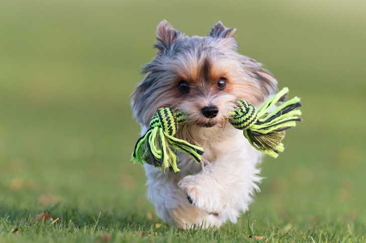 Un Yorkshire Terrier courant avec une corde entre les dents