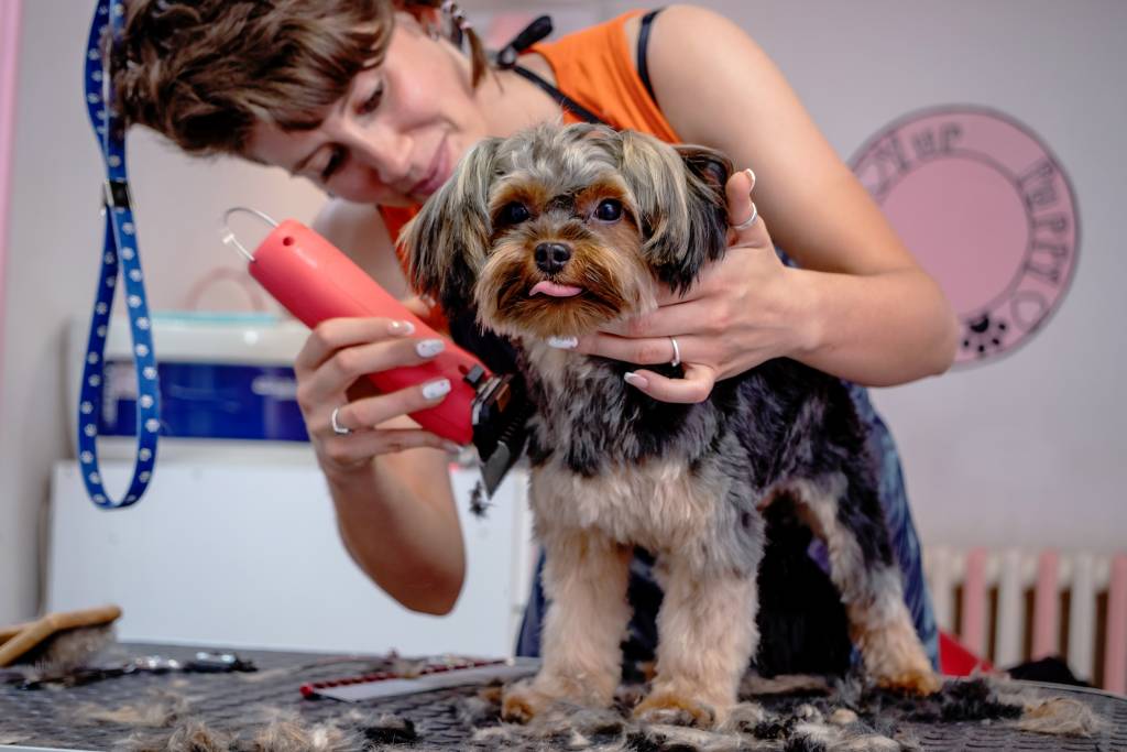 Une toiletteuse professionnelle en train de tondre le pelage d'un Yorkshire Terrier