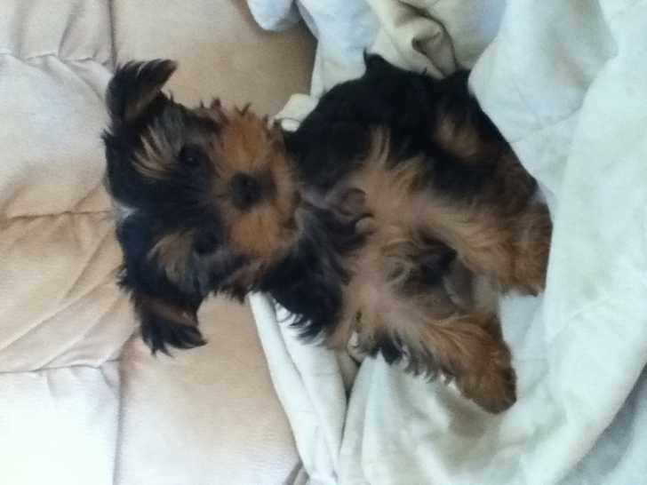 Un bébé Yorkshire s'amuse comme un fou avec une balle