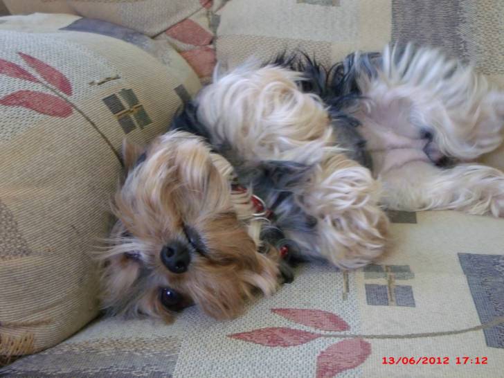 Un bébé Yorkshire s'amuse comme un fou avec une balle