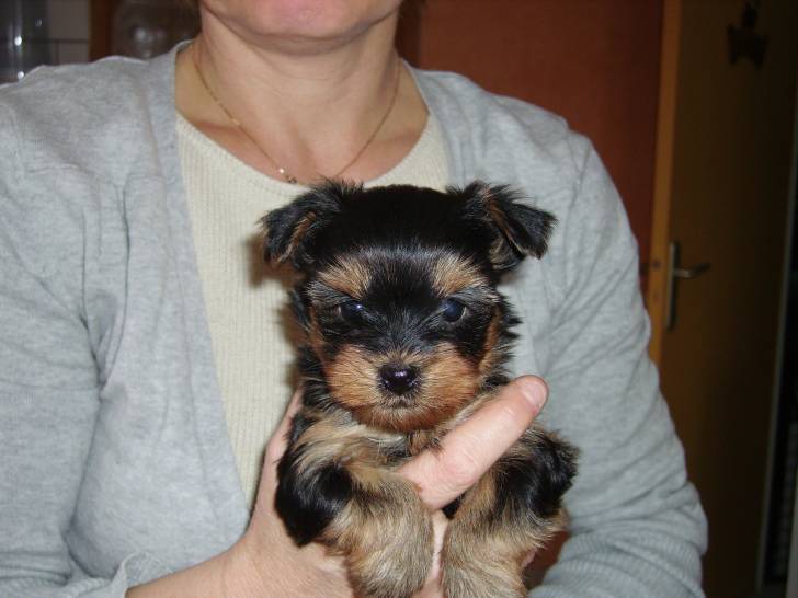 Un bébé Yorkshire s'amuse comme un fou avec une balle