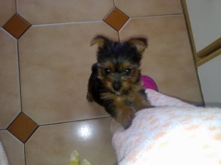 Un bébé Yorkshire s'amuse comme un fou avec une balle