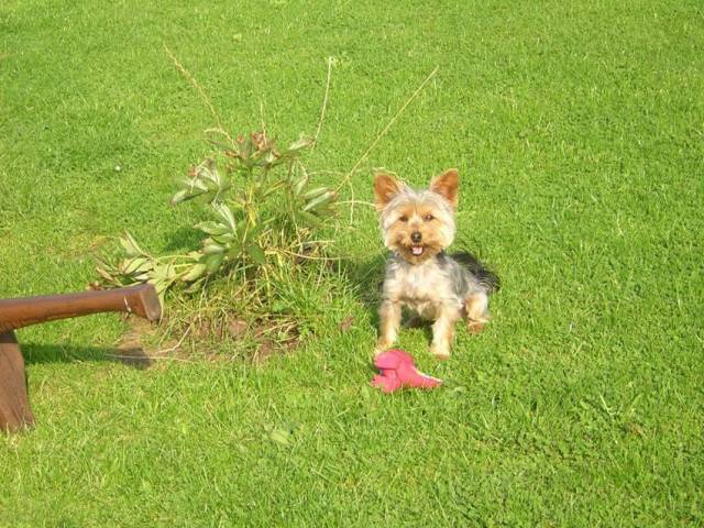 Un bébé Yorkshire s'amuse comme un fou avec une balle
