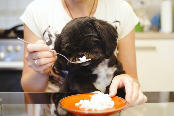 Une femme donne du riz à un petit chien
