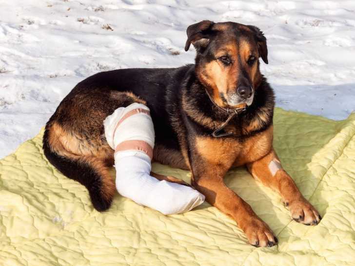 Si on soupçonne qu'un chien s'est cassé une patte ou un autre os, il faut éviter de le déplacer, et ne pas tenter de le soigner soi-même : on risquerait de lui faire mal, voire d'aggraver sa blessure. Mieux vaut appeler un vétérinaire et lui demander son avis.