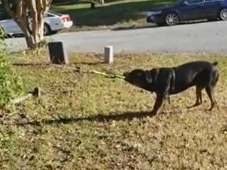 Ce Rotticorso au pelage noir et brun est un grand joueur. Son propriétaire lui a installé un jouet, accroché à un arbre, sur lequel il peut s'amuser à tirer. Le Rotticorso est issu du croisement entre le Rottweiler et le Cane Corso, ce qui en fait un compagnon énergique doté d'une grande force.