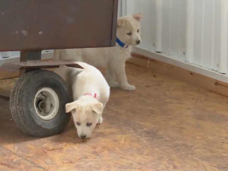 Ces adorables Aussie Siberians au magnifique pelage blanc sont encore jeunes et attendent avec impatience de trouver une famille aimante pour les adopter. Leur propriétaire leur a mis à chacun un collier de couleur différente pour les différencier plus facilement. L'Aussie Siberian est issu d'un croisement entre le Husky Sibérien et le Berger Australien, et ces petits sont doux et attachants.