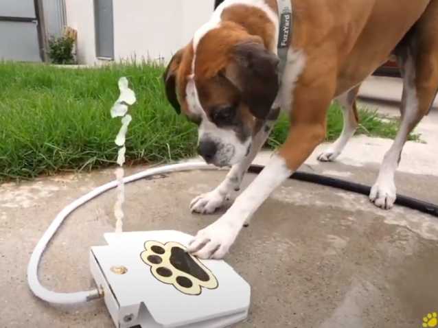 Voici une invention particulièrement sympathique pour nos amis canins : le jet d'eau pour chien. Cela se présente sous la forme d'une pédale à relier à un tuyau d'arrosage. Une pression dessus fait jaillir l'eau à la verticale. Elle peut être facilement actionnée par le chien.