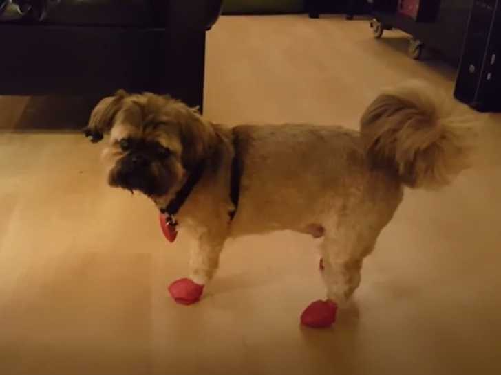 Ce Shiffon a du mal à se déplacer et semble peu apprécier le cadeau de sa maîtresse : elle lui a mis de petits chaussons pour protéger ses pattes, ce qui le déstabilise. Pour l’encourager à les accepter, elle le récompense avec des brocolis, une friandise qu’il semble adorer. Le Shiffon est issu d’un croisement entre le Shih Tzu et le Griffon Bruxellois.