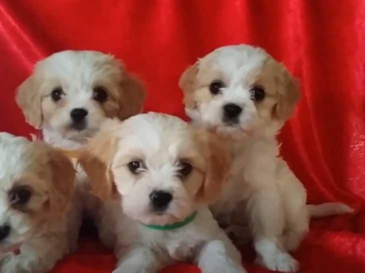 Ces quatre adorables jeunes Cavachons au pelage beige sont installés sur un long drap rouge. Ils sont attentifs à leur maître et très calmes, ils portent chacun un collier de couleur différente pour être plus facilement identifiables. Le Cavachon est un croisement entre le Bichon Frisé et le Cavalier King Charles Spaniel.