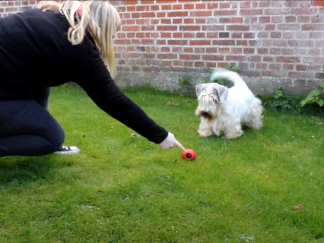 Parfois, la propriétaire du Sealyham Terrier essaie de feinter en imitant le geste du lancement mais le chien n’est pas dupe. Il s’aperçoit vite que la balle est toujours dans la main de sa patronne.