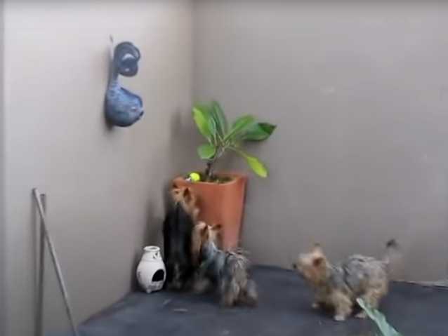 Voici des Silky Terriers qui sont impatients car leur maître leur promet une balle. Il les excite ainsi au maximum avant de lancer l'objet qui fait office de jouet pour chien.