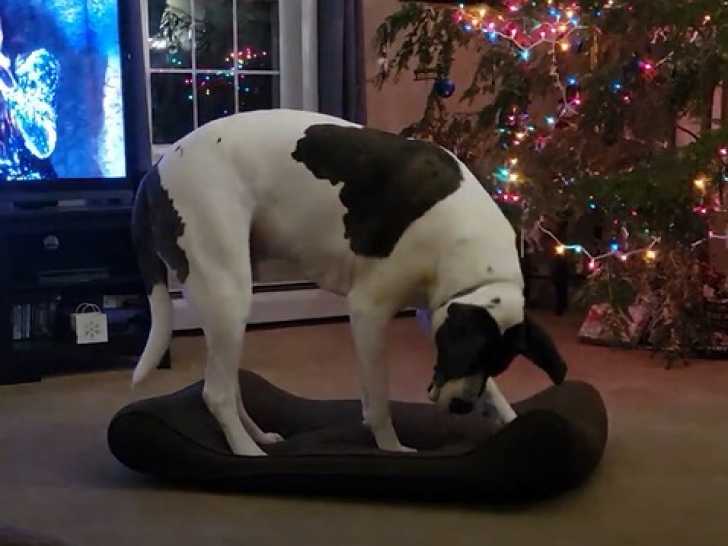 Ce Saint-Dane est présent avec toute sa famille dans le salon. Son panier est disposé au centre de la pièce, près du sapin de Noël scintillant. Après quelques tours sur lui-même, il trouve enfin une position confortable dans son panier. Le Saint-Dane est issu du croisement entre le Saint-Bernard et le Dogue Allemand.