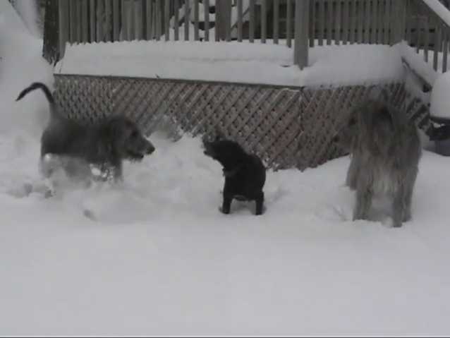 Pas de panique, bien que supérieur en nombre et en stature, ces 2 complices Irish Wolfhound ne sont pas en train d'attaquer le pauvre Labrador.
