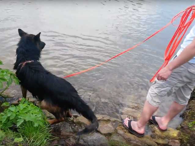 Celui-ci s'amuse à rapporter un objet jeté dans l'eau. Vers la fin de la vidéo, on remarque qu'il perd l'objet, entraîné par le courant. Cependant, il ne l'oublie pas et tient à faire de son mieux pour le retrouver.