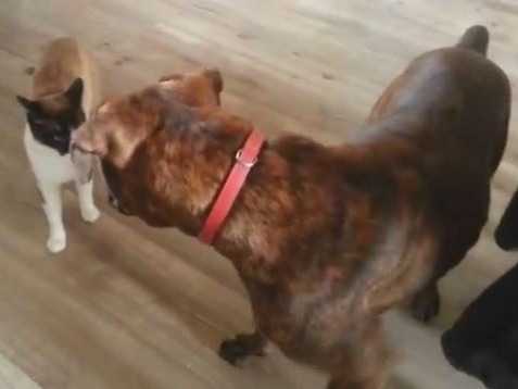 Ce chat siamois et ce chien boxer vivent ensemble depuis toujours et aiment beaucoup jouer ensemble. Un de leurs jeux favoris est la fausse bagarre : on se tourne autour, on se défie du regard et parfois on frappe... Mais toujours en douceur car ces deux-là s'aiment trop pour se faire mal !