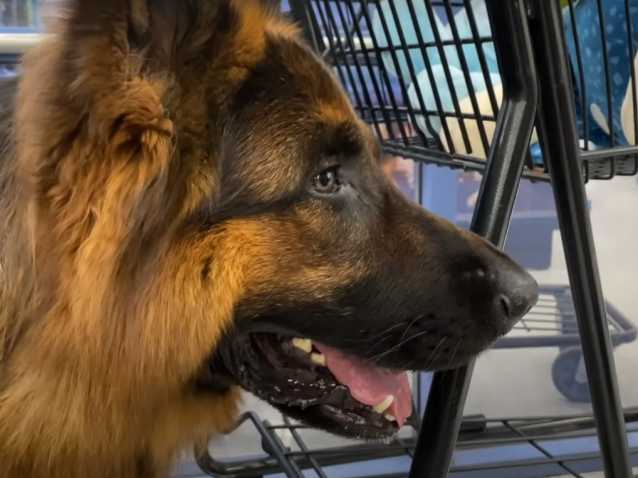 Le Berger Allemand à poil long en profite pour refaire tout son stock de jouets et d'accessoires. Le caddie se remplit très vite et le chien semble impatient de pouvoir jouer avec ses achats.