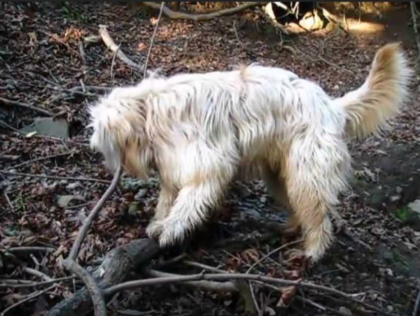 Petite balade en forêt pour ce Berger Catalan, au milieu des bois et de la rivière. En bataille face à une branche de bois récalcitrante, jouant avec un vieux panneau, le Berger Catalan profite du calme du lieu pour dépenser son énergie sans ménagement.