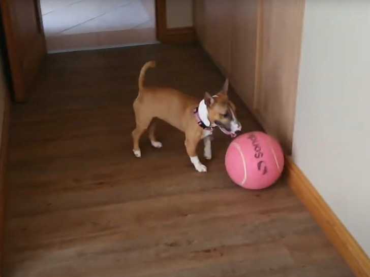 Le jeu occupe une place essentielle dans l’équilibre physique et mental du chien, car il lui permet de dépenser son énergie, de s’exprimer et de renforcer son lien avec son environnement. Le Bull Terrier miniature présenté ici en est un bon exemple : il se lance à toute vitesse à la poursuite d’une balle de tennis de grande taille et manifeste une joie débordante. Ses courses, changements de direction et bonds enthousiastes témoignent de son dynamisme naturel et de son besoin d’activité. Ce type de moment ludique contribue à son bien-être et favorise un comportement détendu au quotidien.