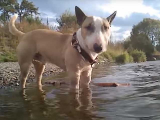 Un bout de bois fait souvent lieu de jouet improvisé en balade : ce Bull Terrier miniature ne veut pas partir sans avoir récupéré son nouveau jouet, quand bien même celui-ci flotte dans la rivière.
