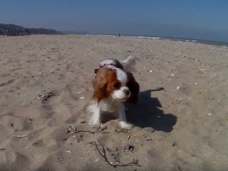 Direction la plage de Deauville pour cet adorable Cavalier King Charles. Ce chien profite pleinement de sa journée à la plage pour s'amuser dans l'eau, sur le sable et avec d'autres chiens.