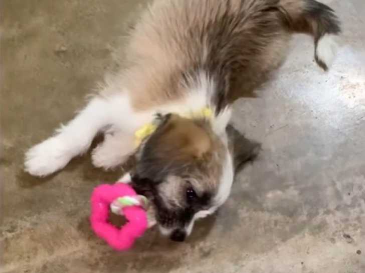 Cet adorable Bea-Tzu, répondant au nom de Tokyo, a reçu un tout nouveau jouet. Il semble totalement comblé et ne le quitte plus d'une patte. Ce jouet coloré est conçu pour aider les chiots à soulager leurs gencives en pleine croissance en leur offrant une surface parfaite pour mordiller et faire leurs dents. Le Bea-Tzu est issu du croisement entre le Shih Tzu et le Beagle.